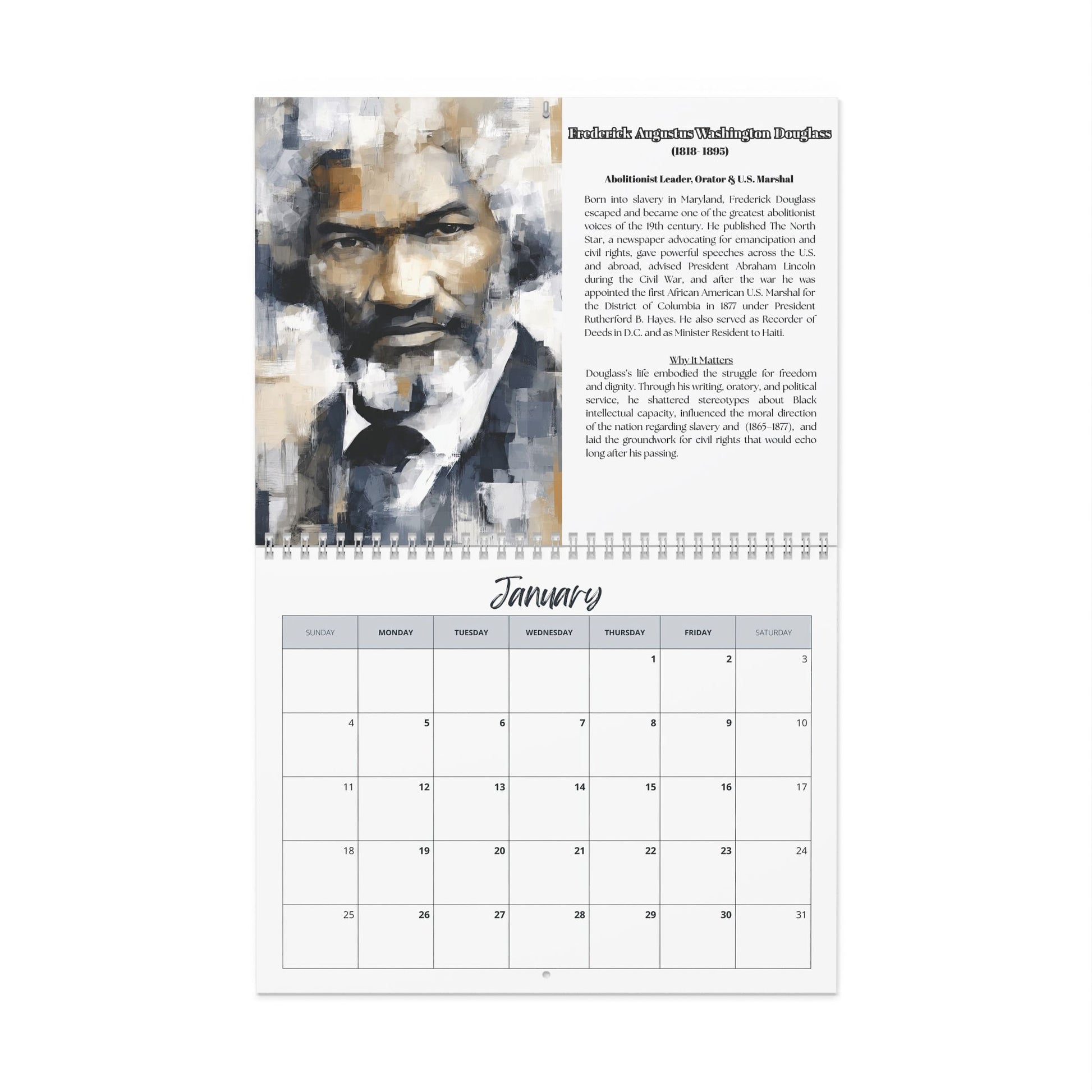 Through abstract modern art-styled portraits and mini-bios, this calendar brings to life changemakers across eras—each month a tribute to purpose-driven leadership and cultural pride.