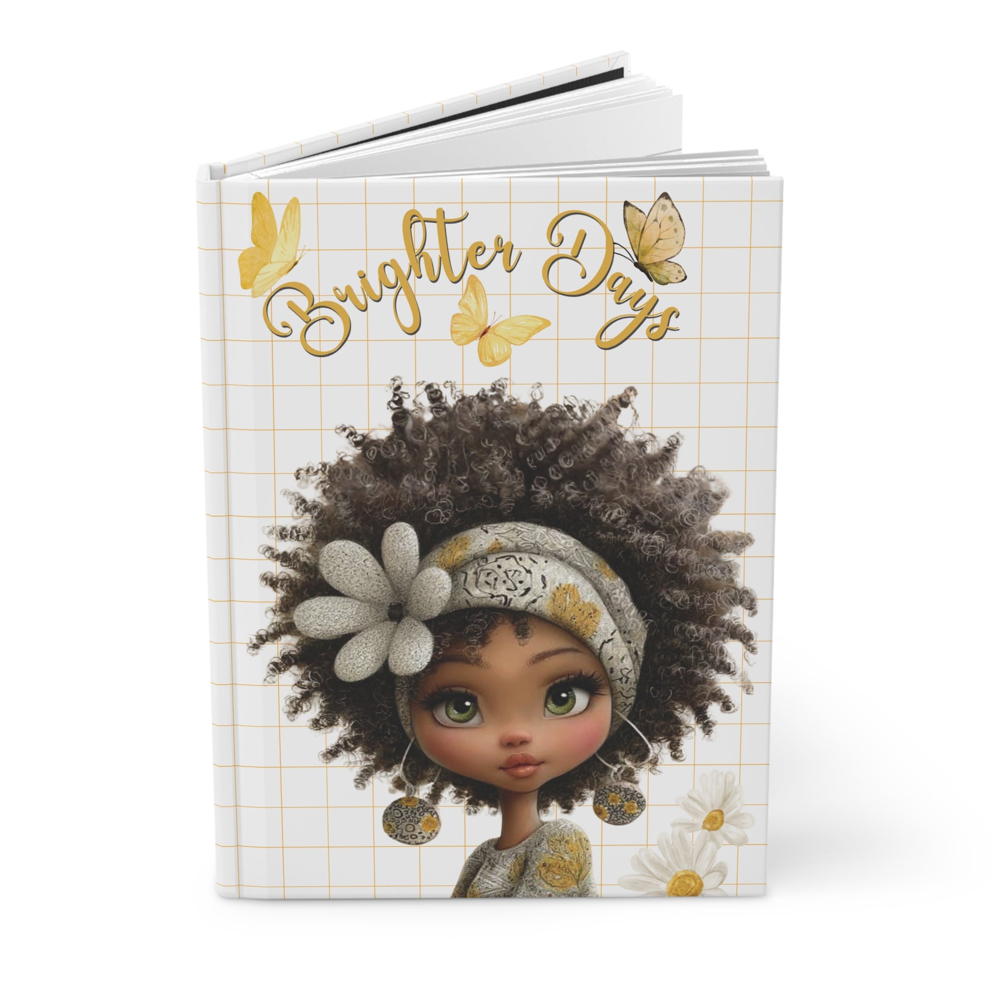 Introducing the hardcover journal that is solely designed for the woman who knows who she is or is on the path of discovering her truth, "Brighter Days" —a beautifully crafted journal designed to inspire and empower with a stunning cover featuring a bold portrait of a beautiful, confident woman against a warm brown background with a serene vibe. This hardcover journal is perfect for jotting down thoughts, goals, and reflections.