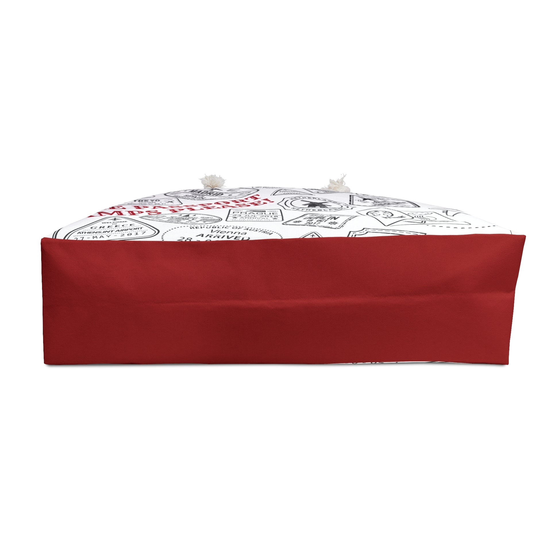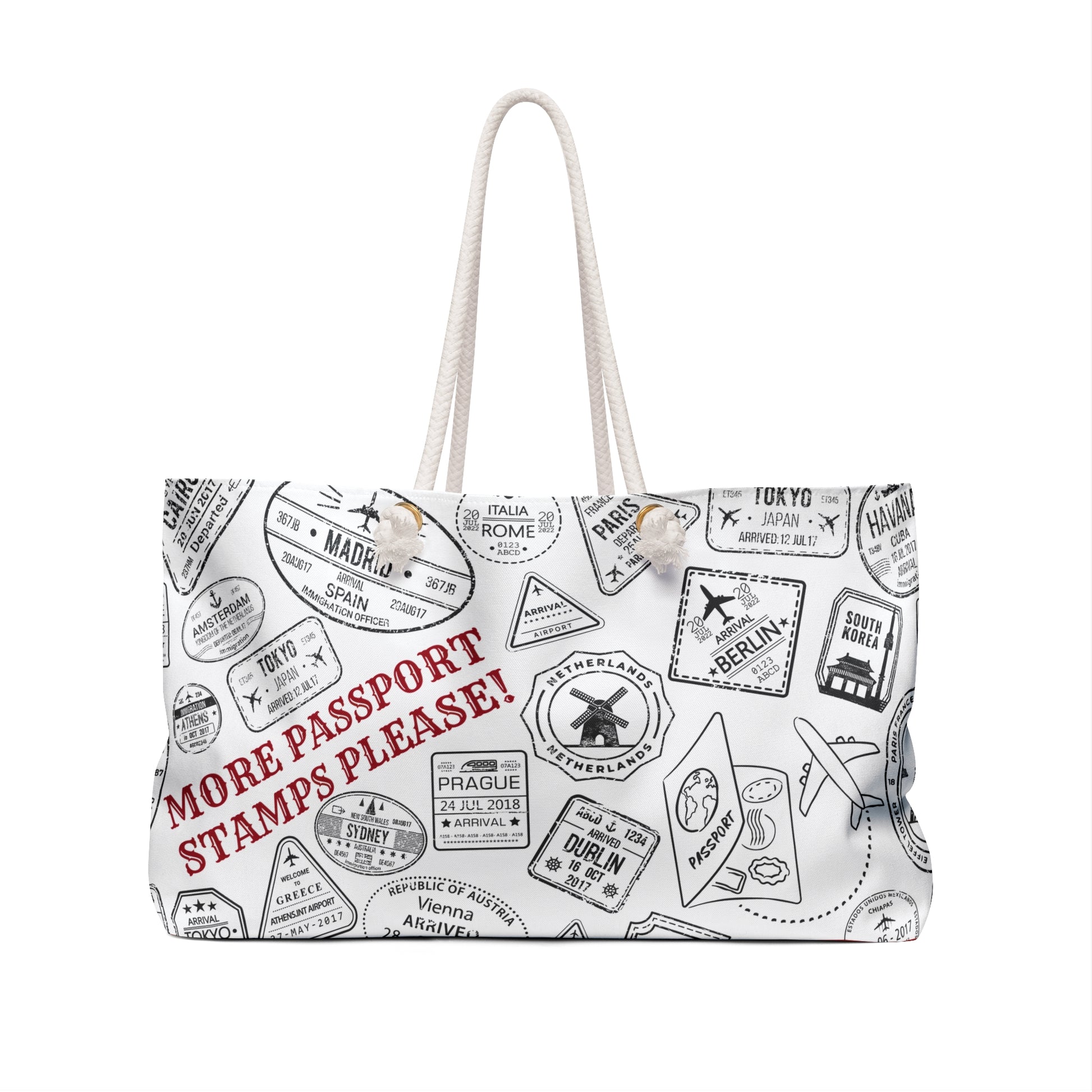 Elevate your travel style with the More Passport Stamps Weekender Bag. Designed for the modern-day wanderlover, this oversized tote features a captivating design of distressed vintage passport stamps that merges art with functionality. Its wide-mouthed structure and durable build are perfect for holding all your essentials for a weekend getaway. Whether you're headed to the beach or exploring the city, its thick rope handles ensure easy carrying. This bag is not just a travel accessory; it's a statement piece that celebrates the beauty of the skies.