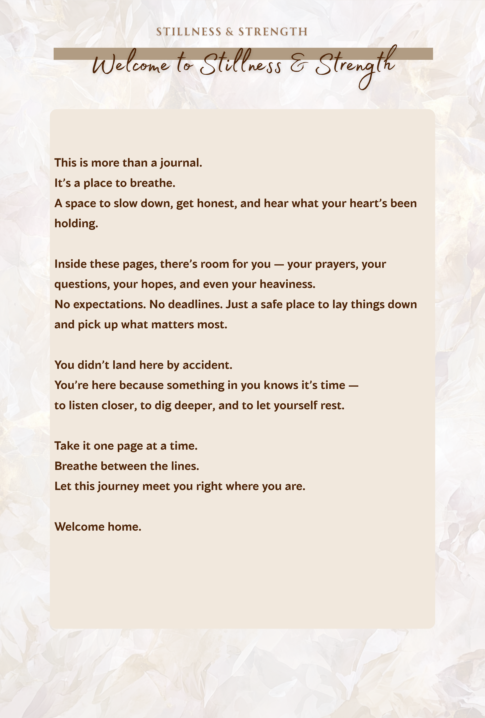 Stillness & Strength was created for those quiet in-between spaces — when the way forward isn’t clear, but you can feel God whispering beneath the noise. Through twelve prayer-centered themes, this journal becomes a companion for your heart — a space to slow down, breathe deeply, and lean into His presence.